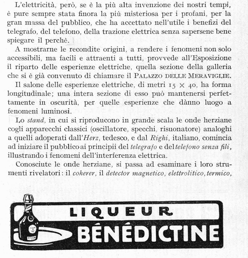 È invisibile, eppure presente ovunque: l’elettricità vibra in tutta l’Esposizione. Nella Galleria disposta su due piani con capriate di ferro e pareti verdi, si materializza nelle diverse forme di apparecchi che producono e distribuiscono l’elettricità. Le esperienze all’interno del “Salone delle Meraviglie” mi dimostrano in maniera tangibile lo sviluppo e l’applicazione dell’elettricità in modo che risulti comprensibile anche ai profani. Quante volte mi è capitato di usare il telegrafo senza sapere nulla sul suo funzionamento! Guglielmo Marconi espone la sua invenzione con cui la parola umana ha conquistato l’etere. Pochi passi e sembra già superata: il prof. Korn presenta la telegrafia per immagini, con cui possiamo vedere cosa è avvenuto pochi minuti fa a Berlino o Parigi. Come può accadere?